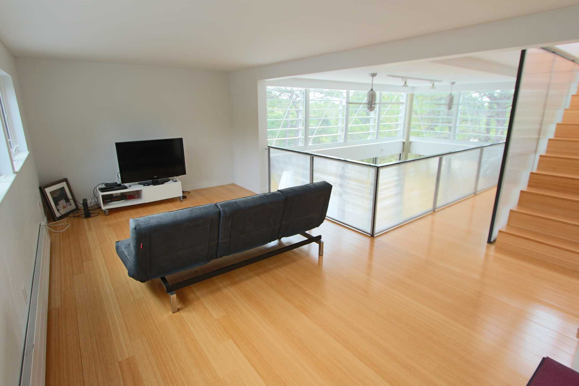 This ultra-modern, architect-designed house is sleek and sharp, with clean lines, bright open spaces, and extensive glass walls. Features include polished concrete floors, double-height space with loft area, and a cozy window seat. A deck to the south is perfect for barbequing. The roof deck provides distant views over the Tree Tops of Truro. An outdoor shower is perfect for rinsing off after a day at the beach. WIFI included. 1.5 miles to beach.